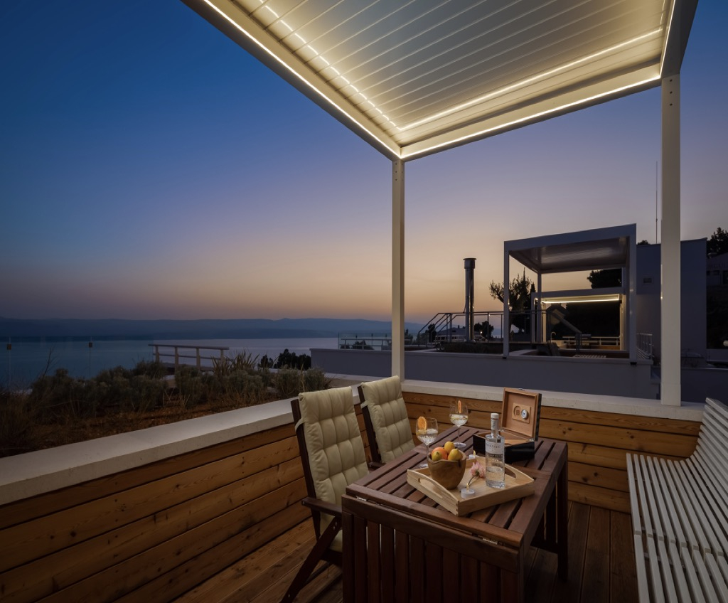 All’esterno, una spaziosa terrazza è il luogo ideale per cenare all’aperto o semplicemente per godersi la fresca brezza marina.
