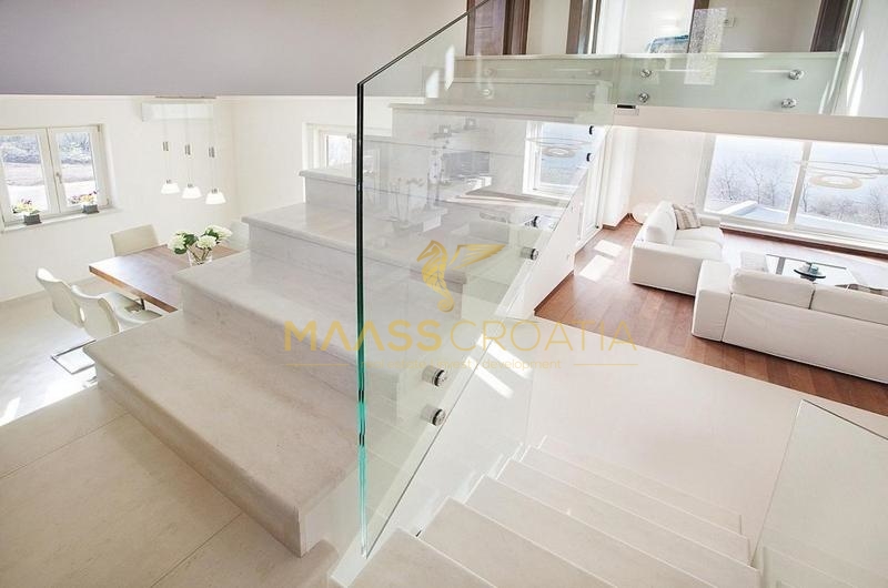 Tutte le porte interne sono state realizzate su misura, mentre i pavimenti in parquet a tre strati di alta qualità, le piastrelle e i rivestimenti in pietra sono stati accuratamente selezionati per integrarsi perfettamente con l’ambiente circostante. Le finestre in alluminio e PVC si armonizzano per colore e consistenza con lo stile elegante della villa.