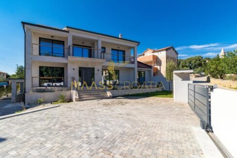 È stata costruita e arredata con particolare cura e attenzione ai dettagli, che si notano già entrando nel giardino anteriore, decorato con pavimentazione in pietra per due o tre posti auto, verde ben curato, impianto di irrigazione, cancelli elettrici di recinzione con telecomando, gradini e colonne in pietra.