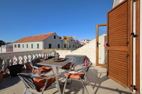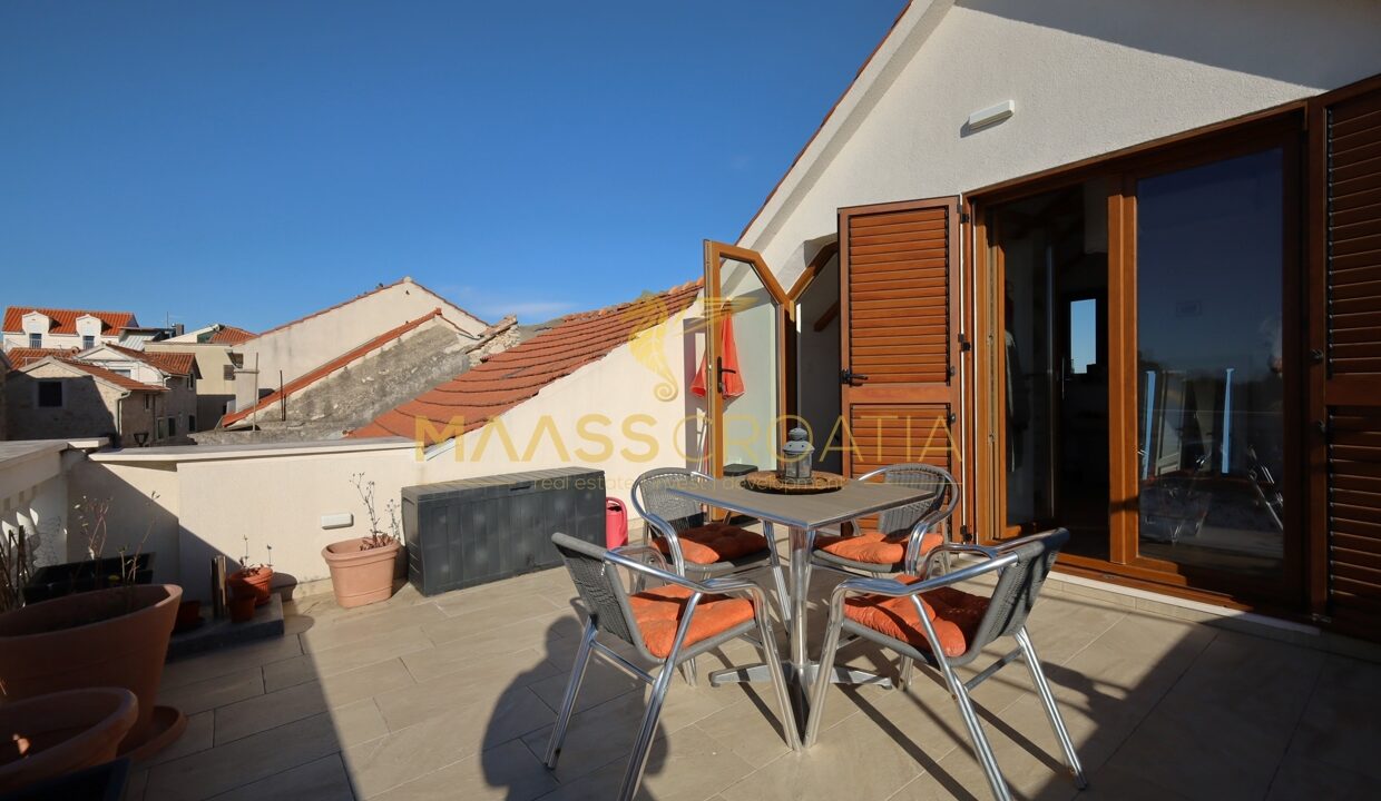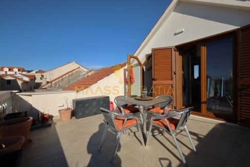 La casa dispone di due terrazze: al primo piano una terrazza di 3,00 m² e all’ultimo piano un’ampia terrazza di 23,57 m² con vista sul centro città, sul parco e sul mare.