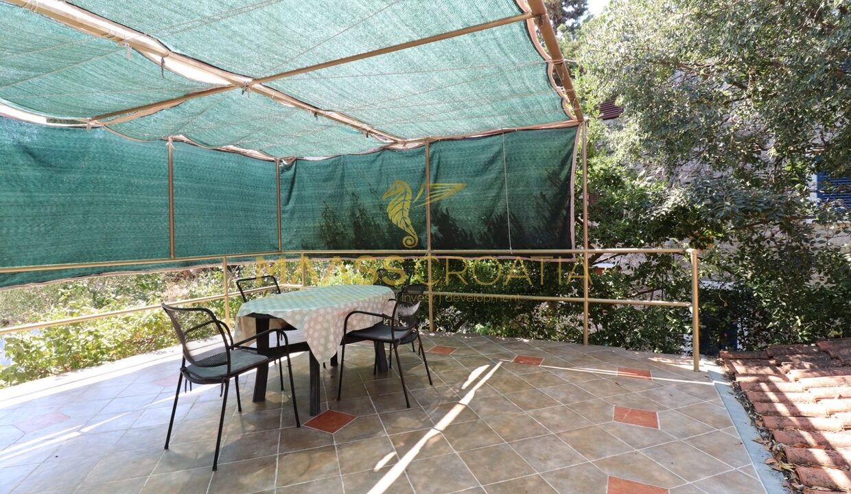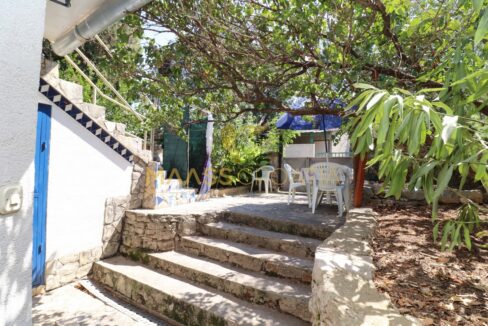 Davanti alla casa c’è un patio con un giardino, ci sono scale esterne che portano alla terrazza sul tetto e una doccia esterna, mentre lo spazio sotto le scale serve come ripostiglio.