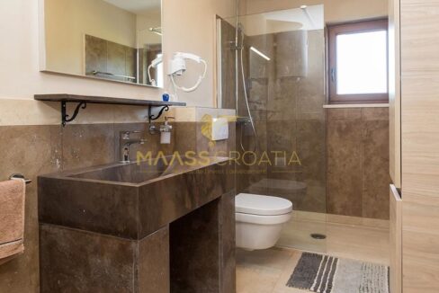 La villa è disposta su due piani. Il piano terra è composto da un soggiorno con zona pranzo e cucina, camera da letto, bagno, dispensa e una sala benessere con sauna, doccia idromassaggio e attrezzature per il fitness. Il soggiorno si apre su una terrazza paesaggistica con un giardino curato con piscina e una cucina estiva con barbecue. La casa è circondata dalla natura e, sebbene si trovi in una zona popolata, offre una completa intimità e privacy.