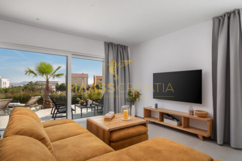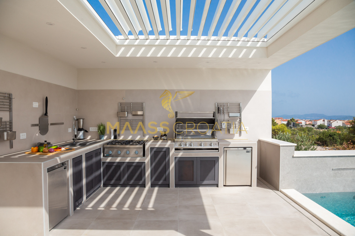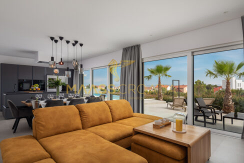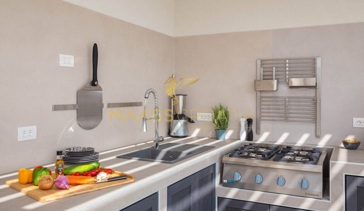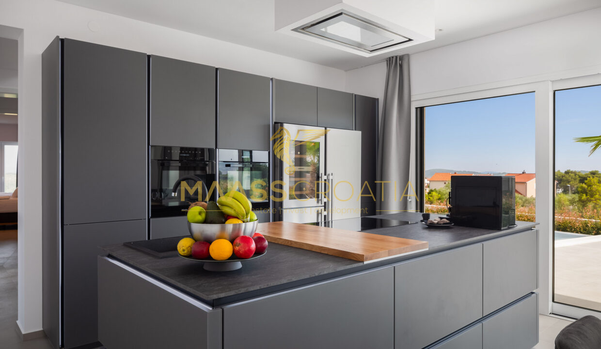 In una posizione tranquilla, una villa dal design e dall’architettura moderni con vista sul mare.