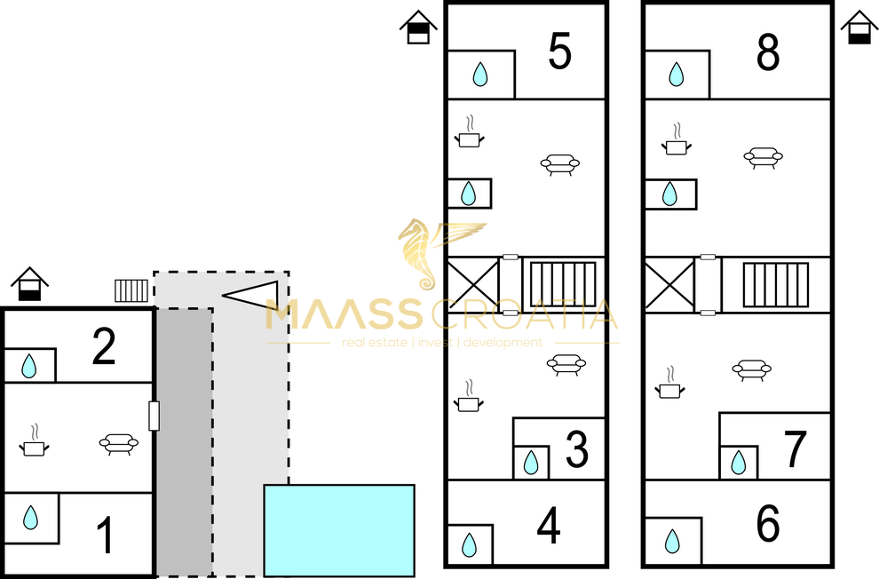 La casa è composta da cinque unità abitative completamente arredate e dotate di tutti gli extra.