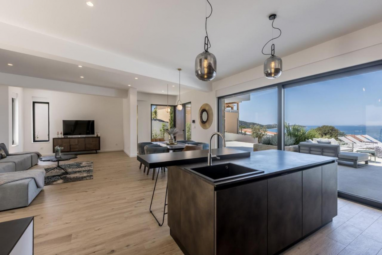 Atemberaubender Meerblick von Haus und Pool: Wunderschöne Steinvilla auf einem Hügel