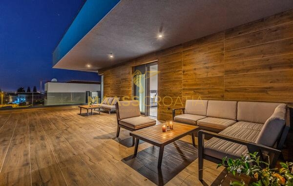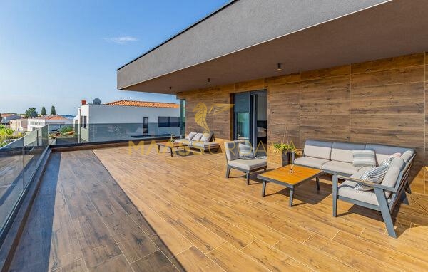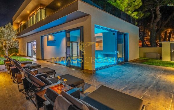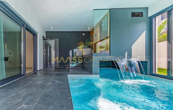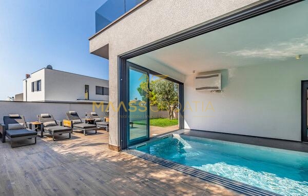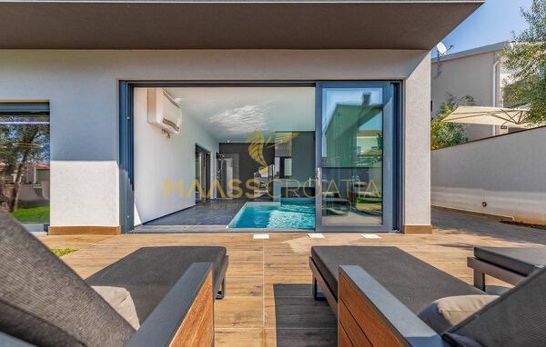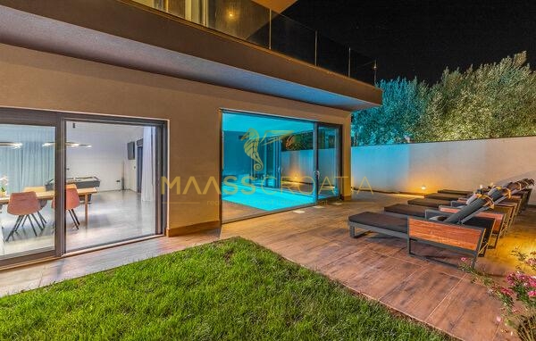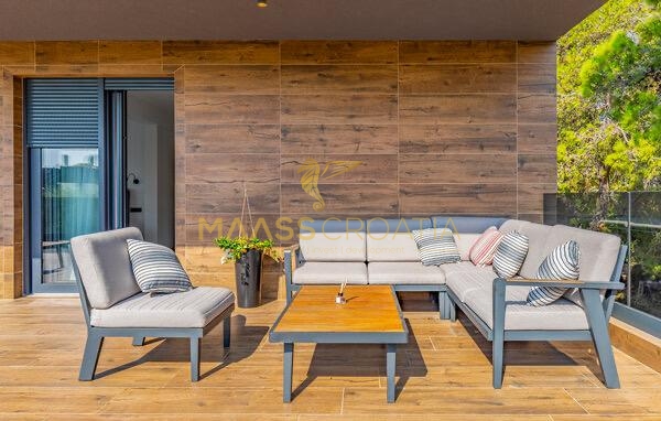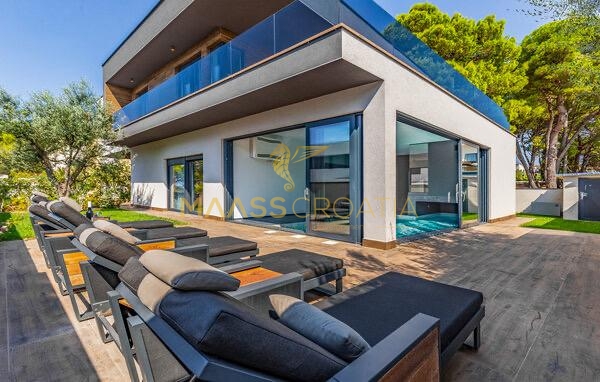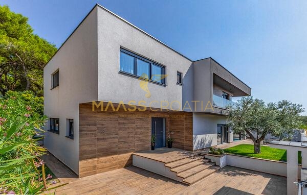 In vendita una villa moderna con piscina, a soli 200 metri dalla spiaggia. La villa ha 285 m² di superficie abitabile ed è situata su un terreno di 480 m² circondato da pini.
