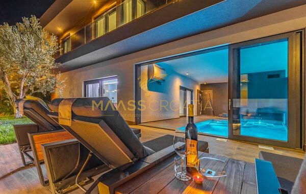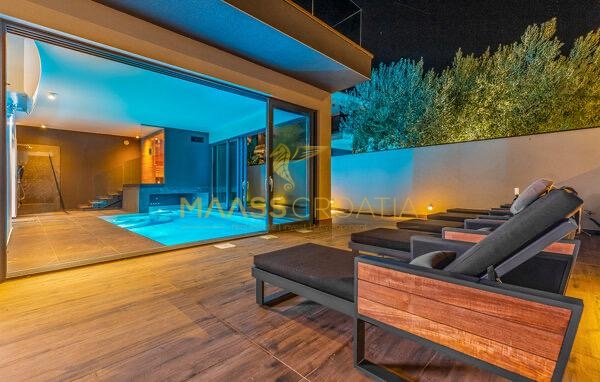 È composta da un ampio soggiorno con cucina e zona pranzo, una camera da letto, una sauna con doccia e una piscina interna/esterna al piano terra.
