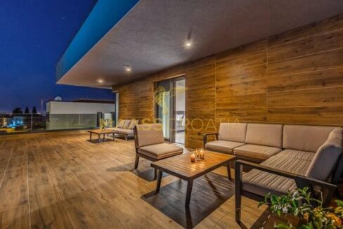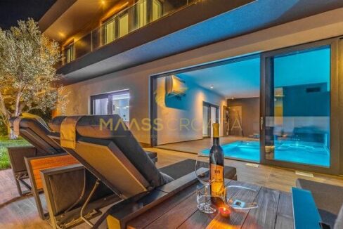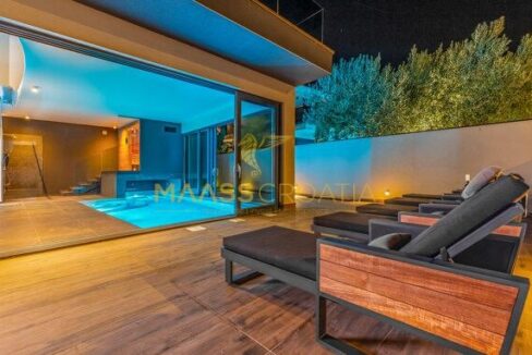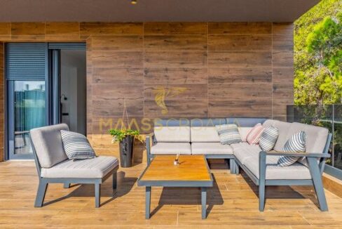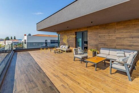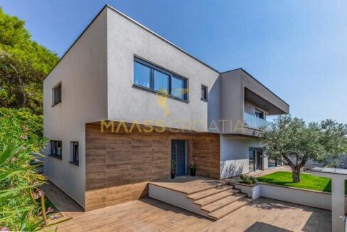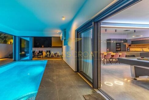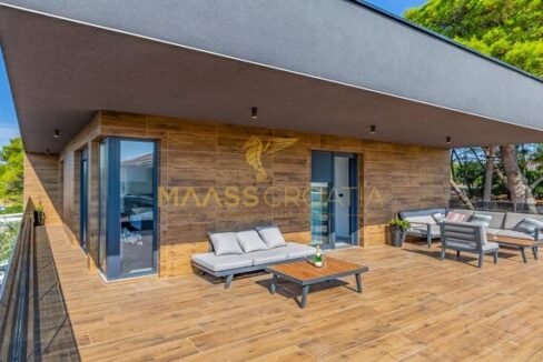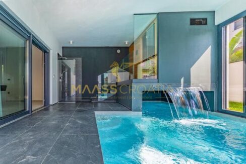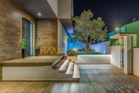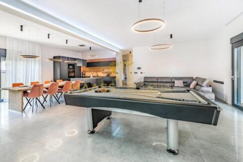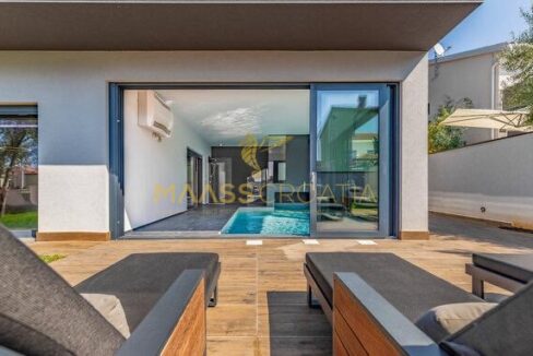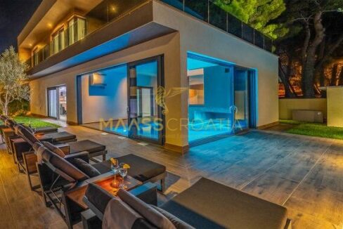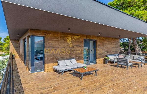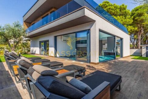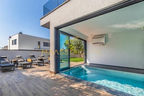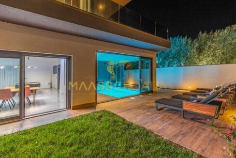 In vendita una villa moderna con piscina, a soli 200 metri dalla spiaggia. La villa ha 285 m² di superficie abitabile ed è situata su un terreno di 480 m² circondato da pini.