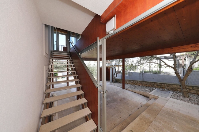 L’ingresso al piano terra, visivamente sofisticato e che ricorda lo stile della metà del secolo scorso, offre un’ampia area coperta con diverse possibilità di utilizzo. Da quest’area esterna si può accedere a un ripostiglio.