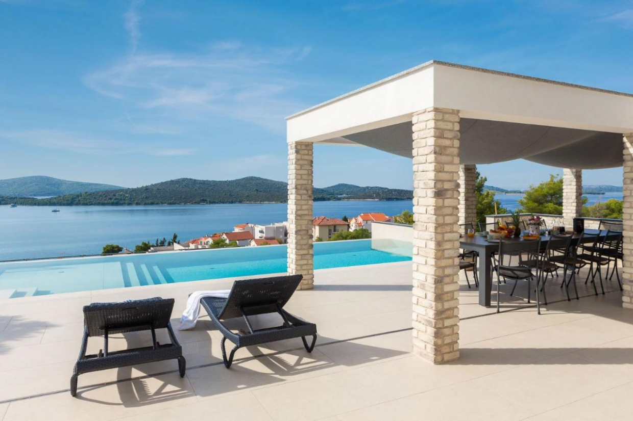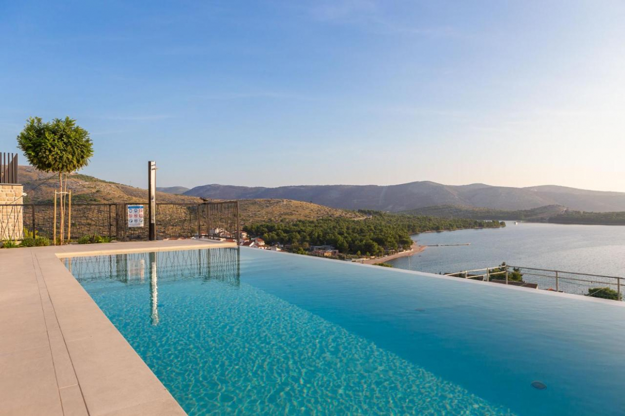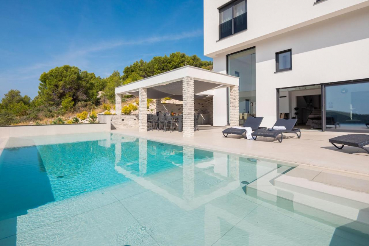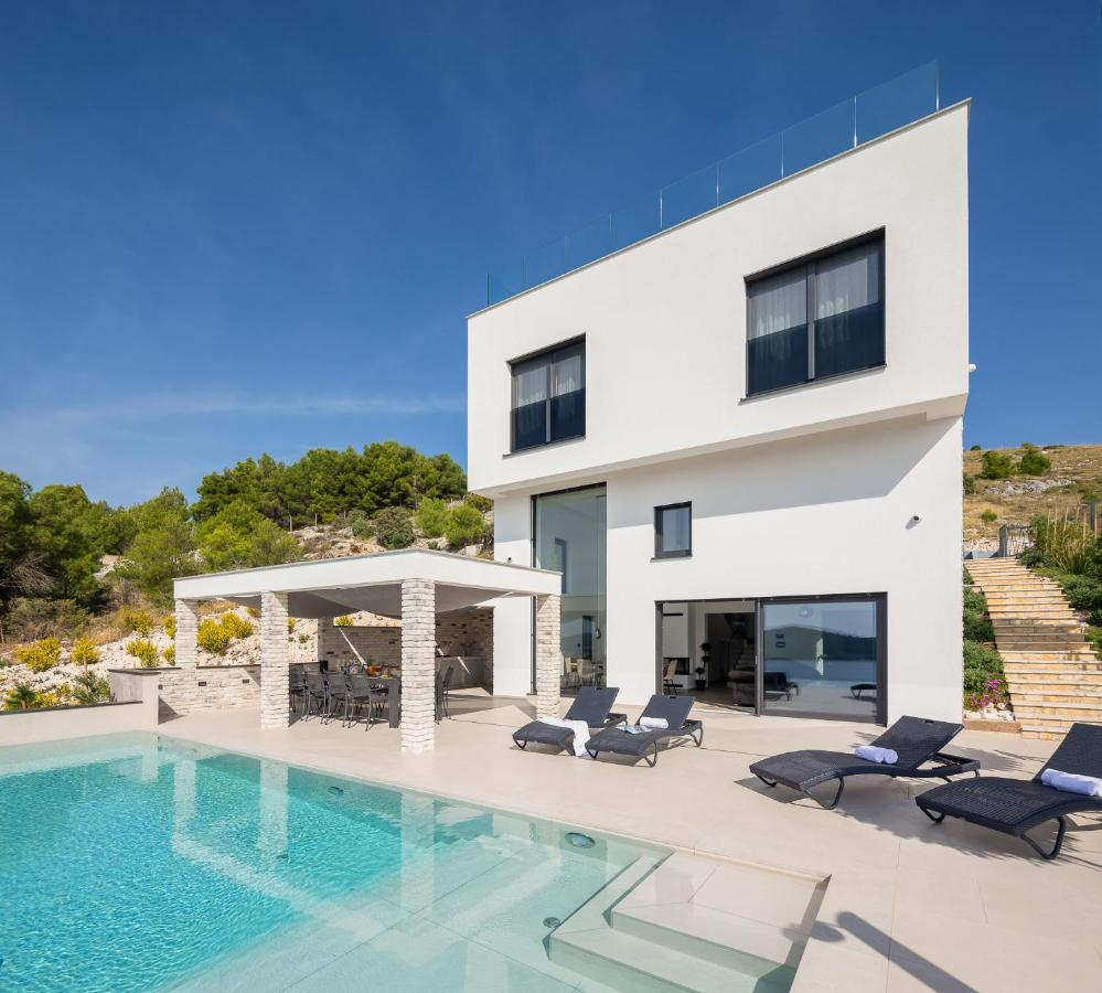 Atemberaubender Meerblick von Haus und Pool: Wunderschöne Steinvilla auf einem Hügel