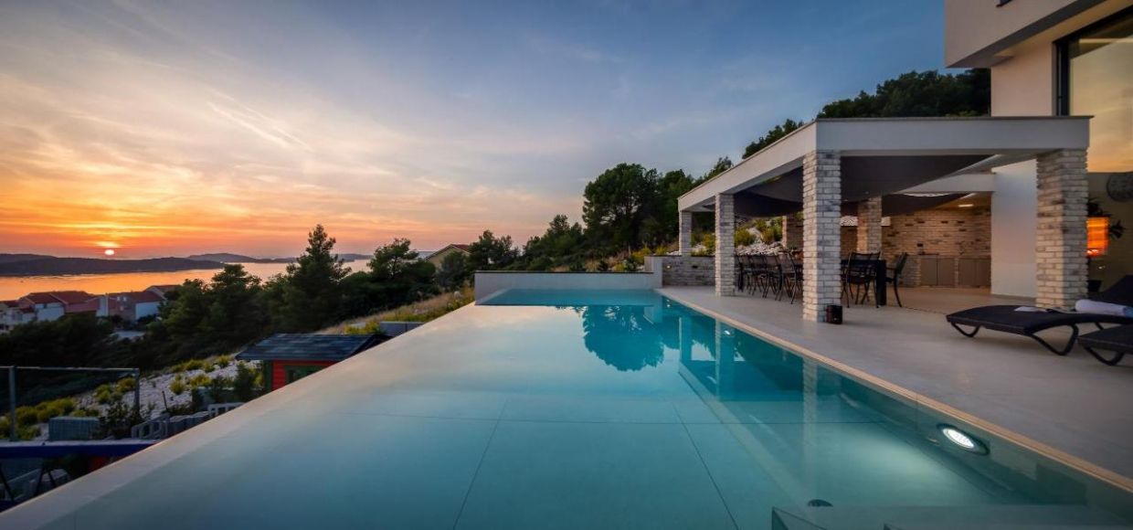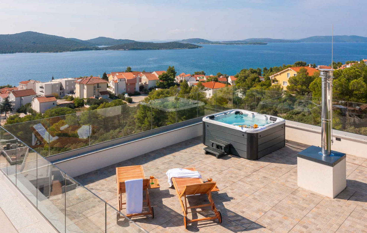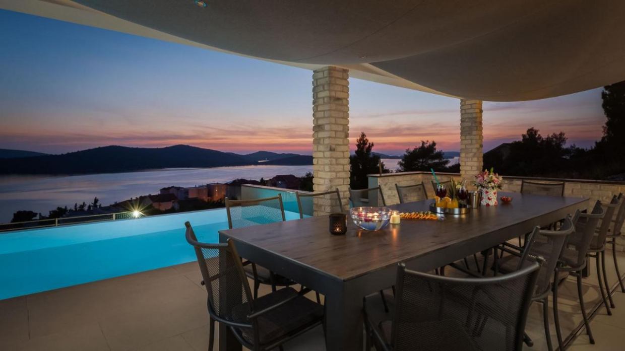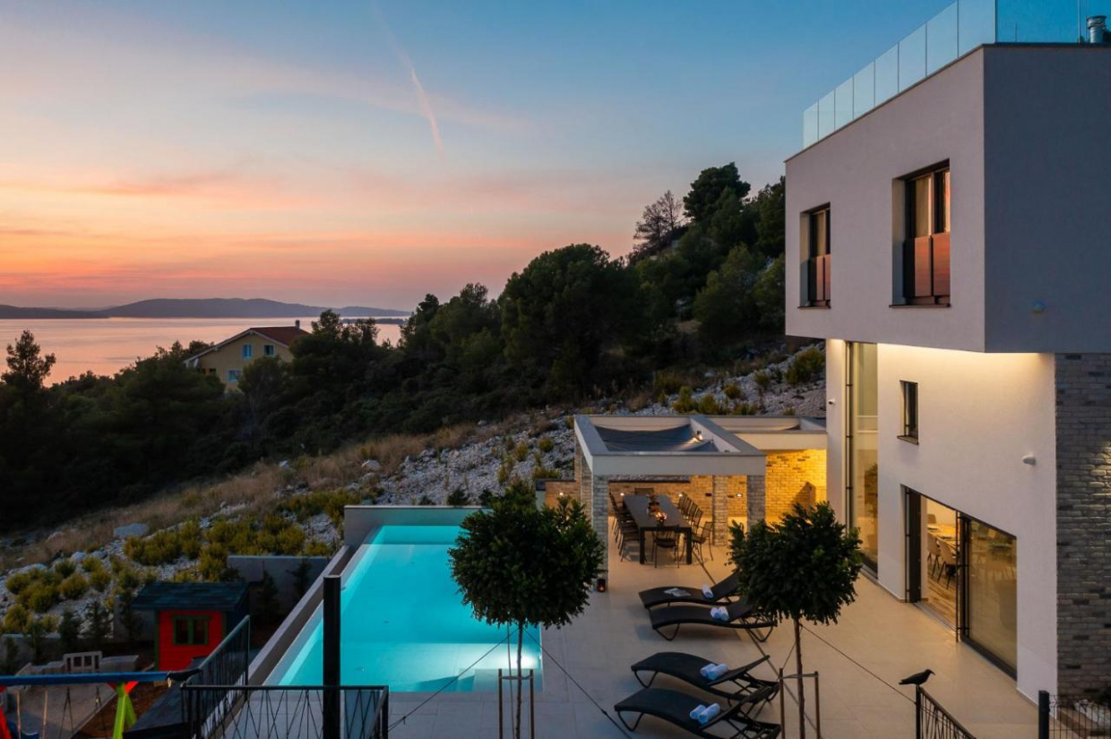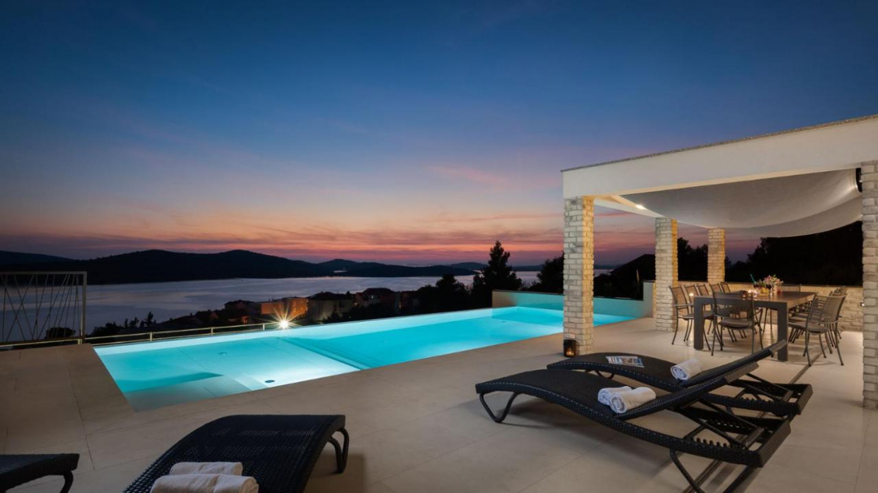Atemberaubender Meerblick von Haus und Pool: Wunderschöne Steinvilla auf einem Hügel
