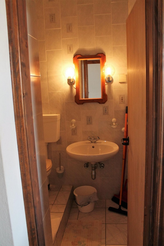 Al piano terra della casa si trova un grande garage con pavimento piastrellato, che potrebbe essere utilizzato anche per altri scopi, ad esempio come sala comune o per feste. Qui si trova anche un bagno con doccia e WC.