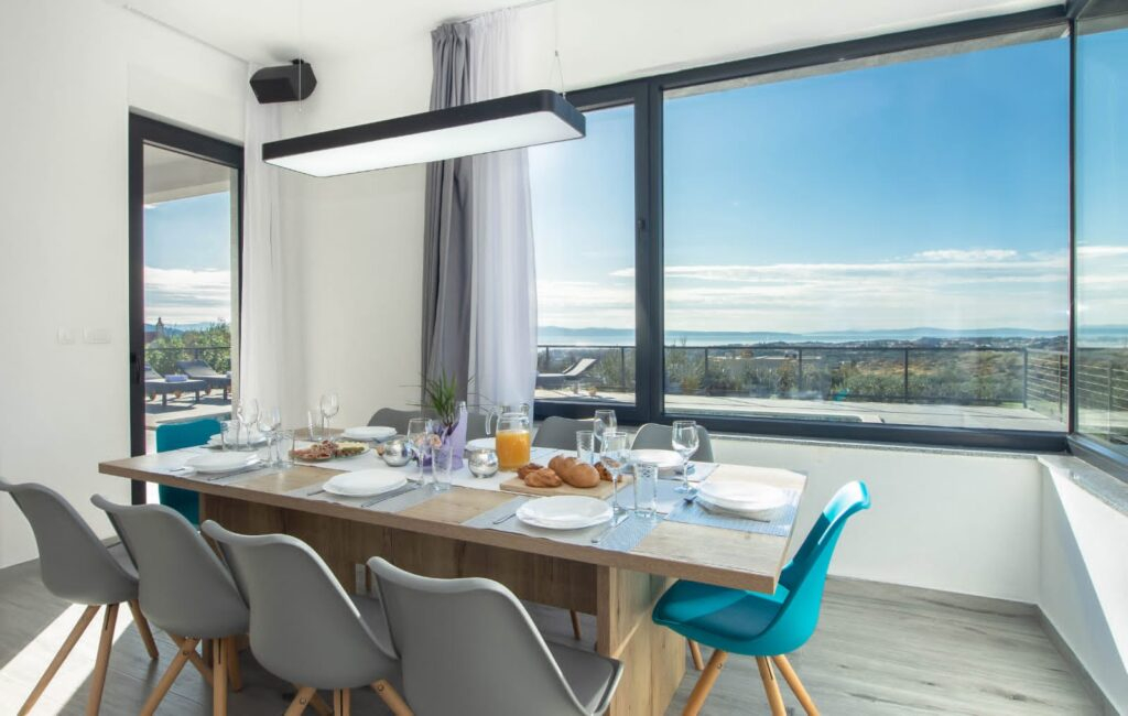Un buon esempio è l’ampia terrazza esterna, perfettamente collegata alla zona pranzo del soggiorno interno.