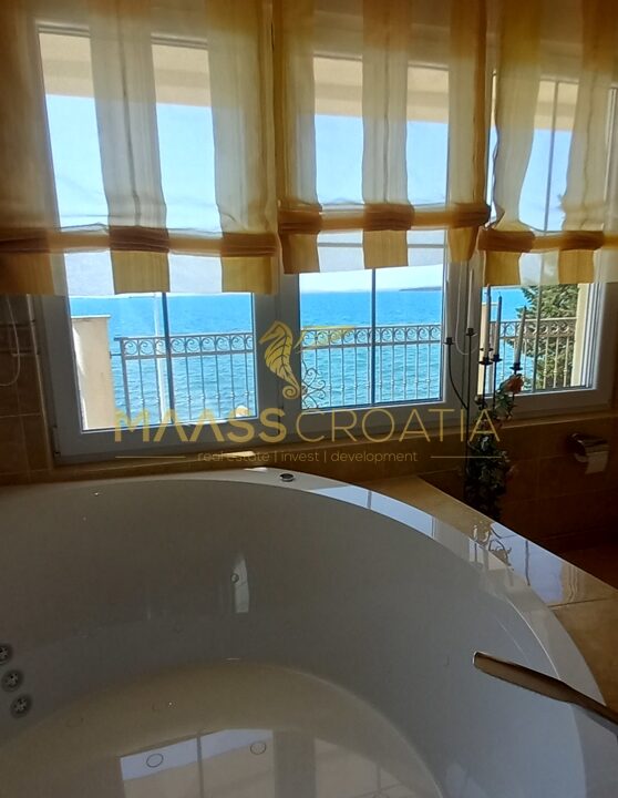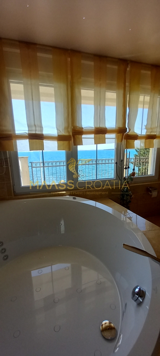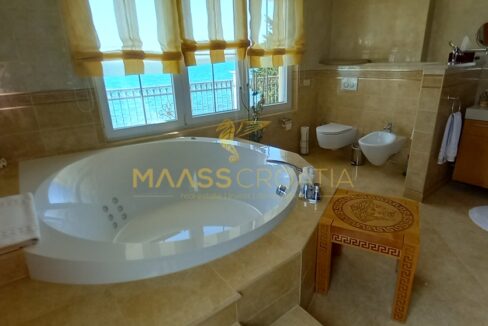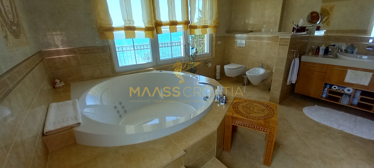 L’imponente bagno con luce naturale e affascinante vista sul mare offre tutti i tipi di extra, una vasca idromassaggio e una sauna.