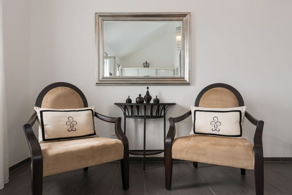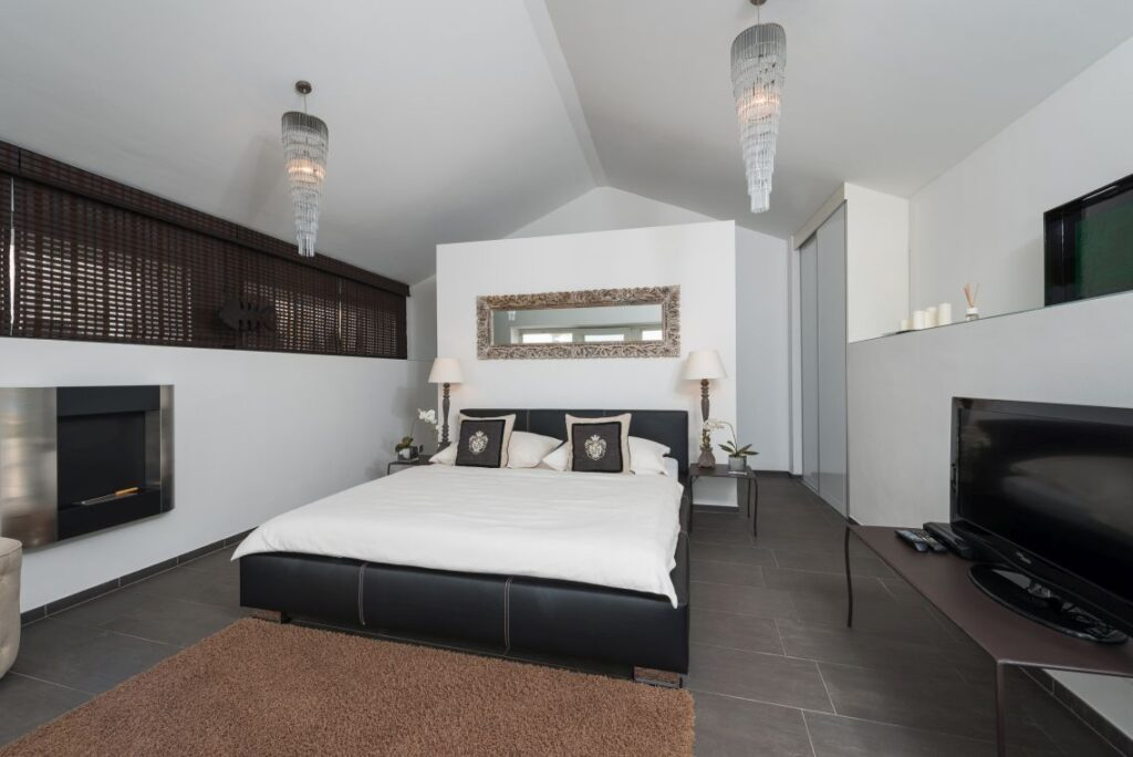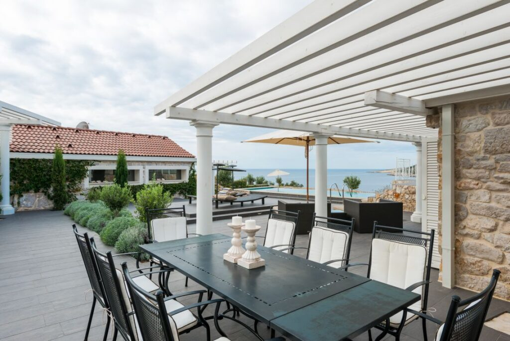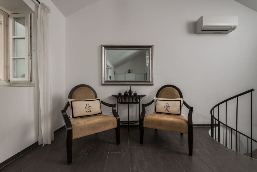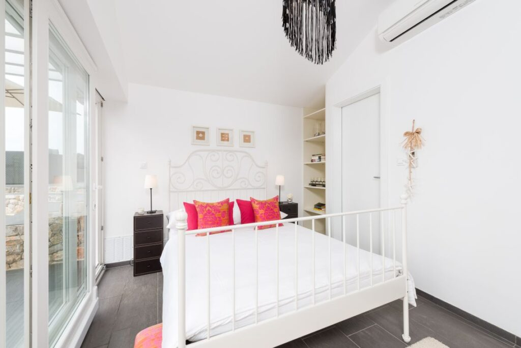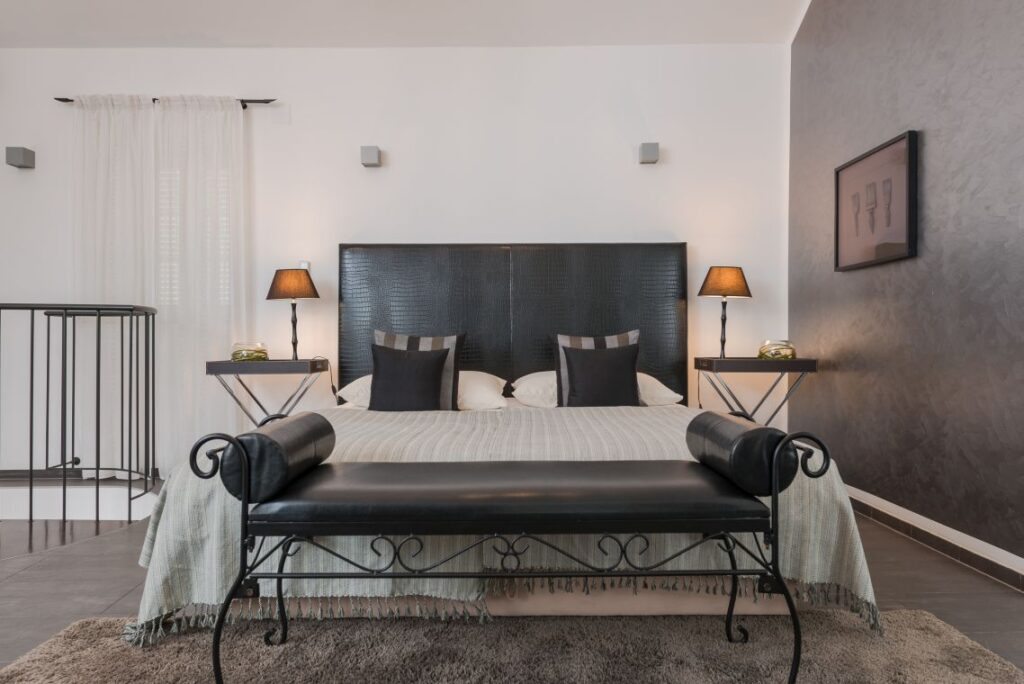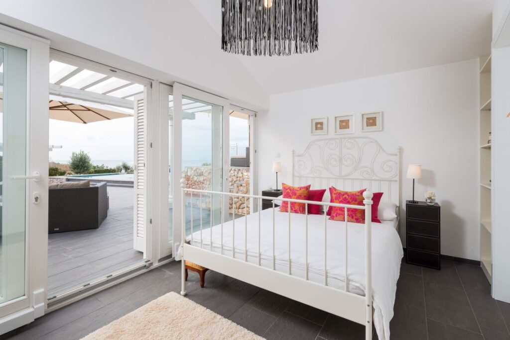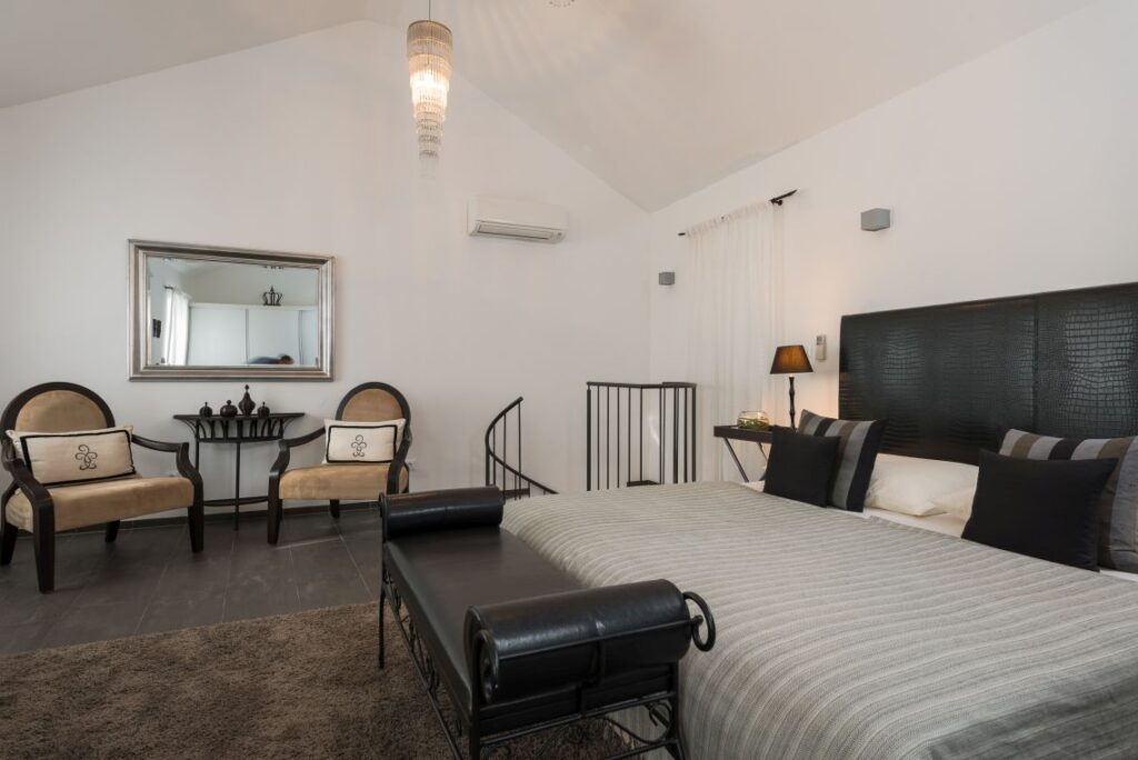 I due piani sono collegati al primo piano tramite una scala a chiocciola. Qui si trovano una spaziosa camera da letto principale e una splendida terrazza con comode sedie per rilassarsi e godersi la vista della proprietà, della piscina e del mare infinito.