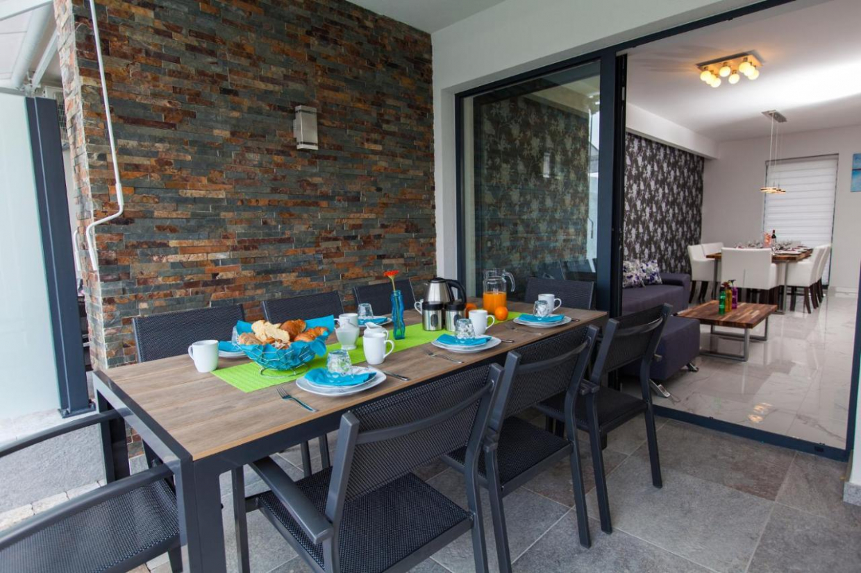 La grande piscina è perfettamente posizionata sulla terrazza ed è coronata da alcune palme tropicali che vi faranno sentire come se steste vivendo la vostra fantasia tropicale nel cuore della regione del Quarnero!